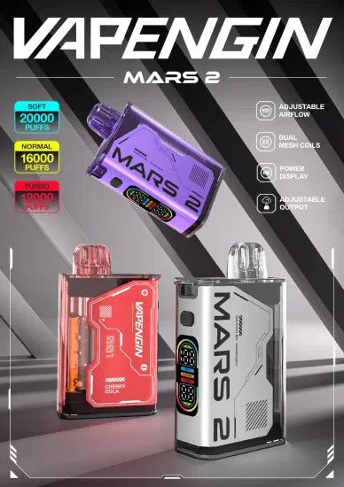 Dedicated in creating futuristic product, Team VAPENGIN introduces the VAPENGIN MARS 2 Disposable Vape. MARS 2 adopts see-thru body to showcase the inner structure of the device while maintains its Cyberpunk style full of technological and futuristic sense. Moreover, its intelligent data display technology ensures barrier free vaping experience by displaying the time of vape and battery level via a high-definition and colourful screen. Its Dual Mesh Coil and isolated e-juice-coil separated technology brings consistent original flavour and layered tastes.
